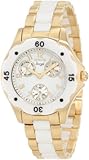 - Flame-fusion crystal; brushed gold ion-plated stainless steel case and bracelet with white ceramic center links