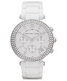 This beautiful Michael Kors MK5654 women's chronograph watch features a stunning white ceramic band, glitz around the bezel and on the markers, three subdials, a date window and luminous hands.